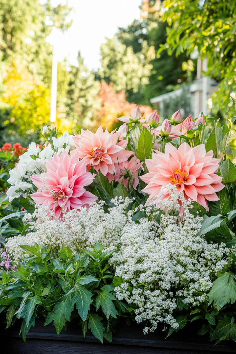 The striking pink dahlias create a stunning focal point, beautifully complemented by delicate white flowers that soften the overall palette. To replicate this vibrant look, choose a mix of bold and subtle blooms, ensuring a balance of heights and textures for visual interest.