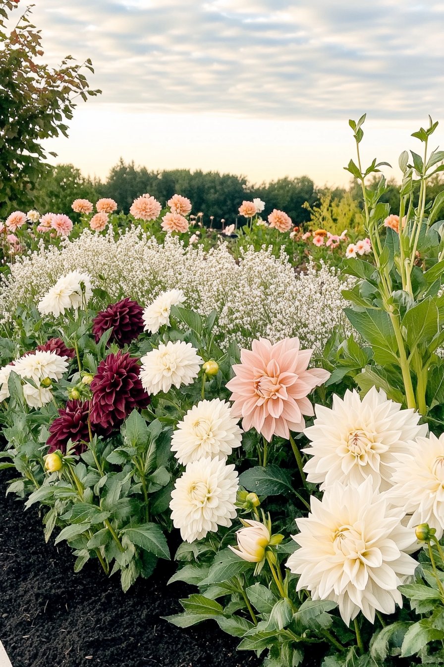 A stunning display of dahlias in soft pinks, whites, and deep burgundies creates a vibrant yet harmonious garden scene, perfect for attracting pollinators. To replicate this look, consider layering different dahlia varieties with delicate fillers like baby’s breath for added texture and depth.