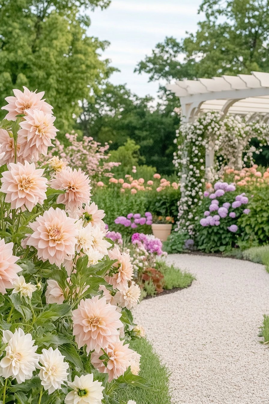 The garden features a stunning array of dahlias in soft pinks and whites, creating a romantic and inviting atmosphere. To replicate this look, combine dahlias with low-growing groundcovers and choose complementary colors for a vibrant, layered effect.