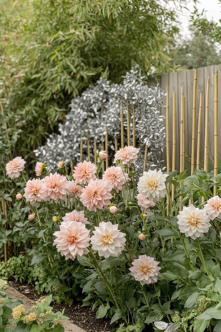 The garden beautifully showcases lush dahlias in soft pink and creamy white hues, creating a serene yet vibrant atmosphere. To replicate this look, incorporate bamboo accents for height and contrast, and ensure regular watering to keep the dahlias thriving.