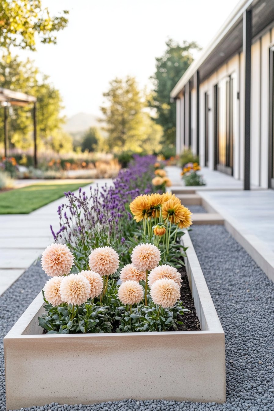 This captivates with its soft peach dahlias juxtaposed against vibrant lavender, creating a harmonious blend of color and texture. To replicate this look, consider using raised beds and incorporating gravel pathways for a modern touch while ensuring proper drainage.