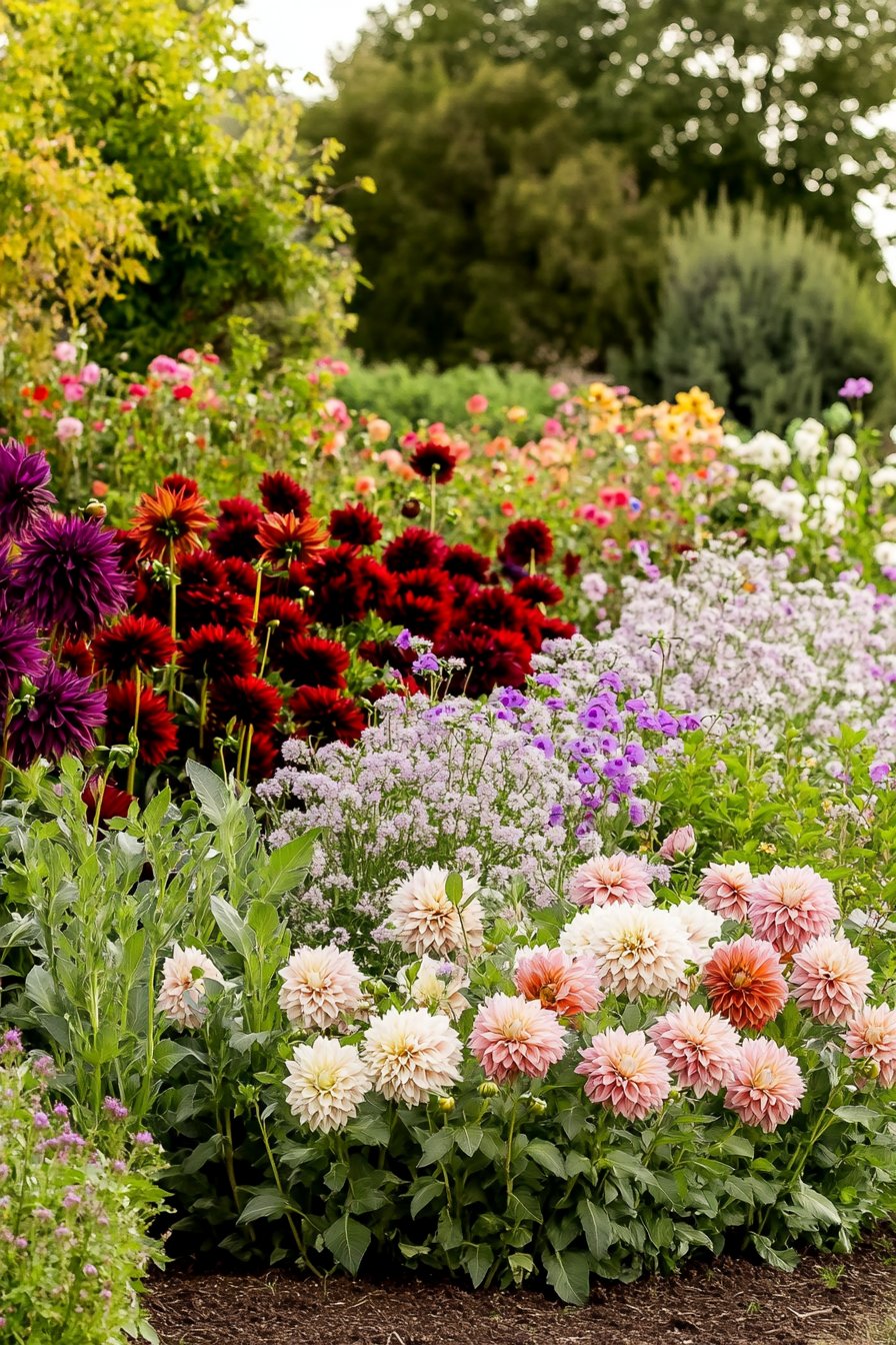 This vibrant garden bursts with color, showcasing rich dahlias in shades of deep red, purple, and soft pastels, harmoniously blending with delicate flowering plants. For a similar effect, layer tall and short plants, ensuring a mix of textures and colors to create visual interest throughout the seasons.