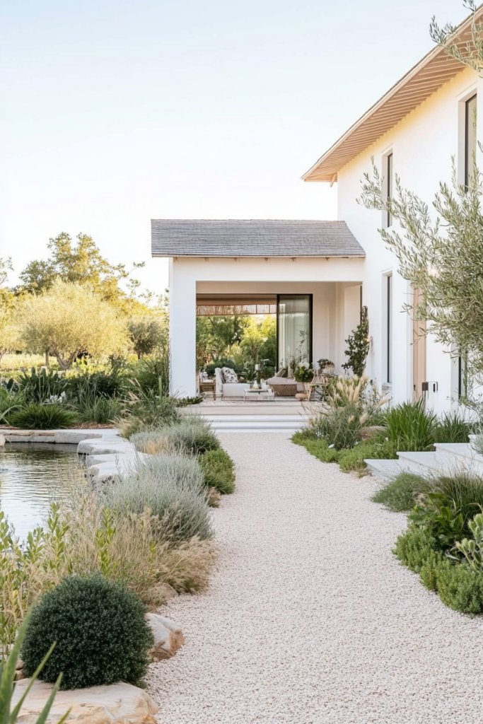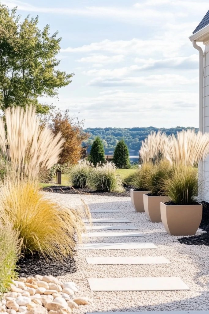 This sleek garden features a clean gravel path, modern planters, and ornamental grasses swaying gently. Keep the look minimalist with neutral tones and well-placed greenery for a contemporary feel.