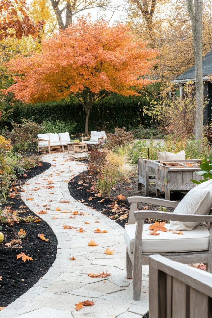 A winding stone pathway weaves through a garden filled with vibrant autumn leaves and rustic wooden furniture. Ideal for creating a cozy seasonal outdoor retreat.