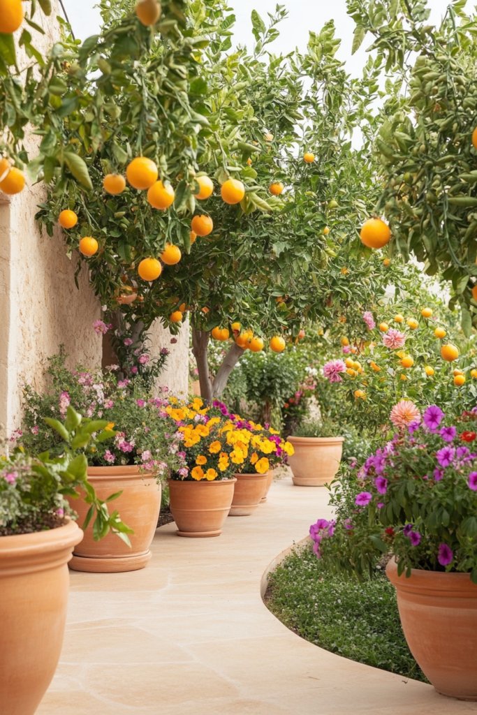 A curved terracotta pathway winds through a lush Mediterranean garden with citrus trees and terracotta pots overflowing with vibrant flowers. Perfect for a vibrant yet calming atmosphere.