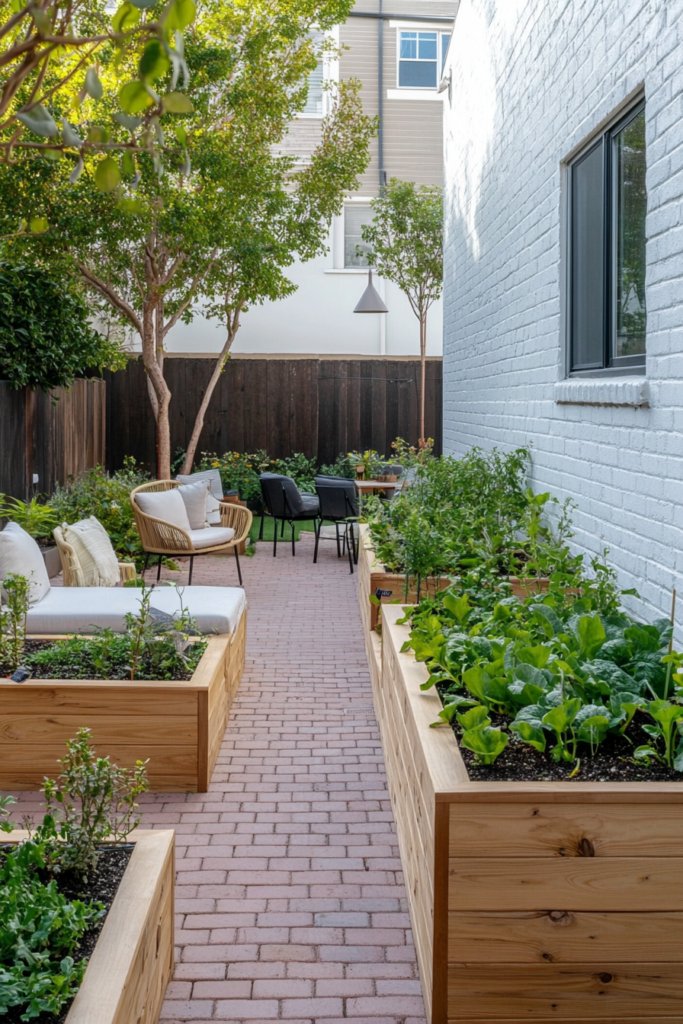 Perfect for small spaces, this urban garden features a narrow brick pathway, raised plant beds, and modern outdoor furniture. Use sleek, minimalist planters for a contemporary look.