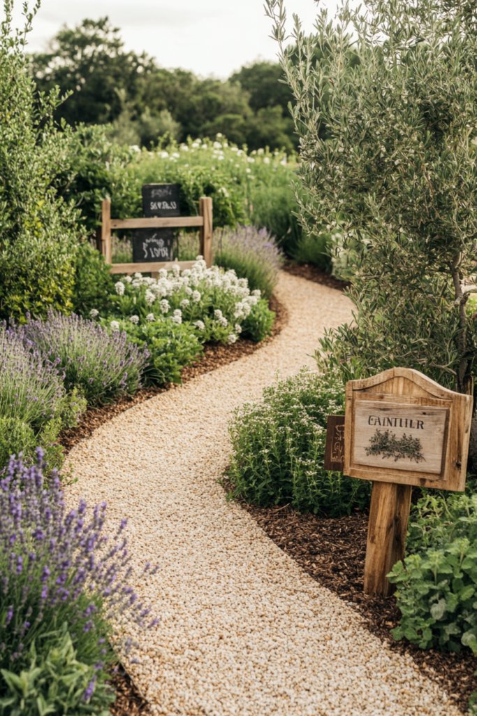 A gravel pathway is lined with fragrant herbs like lavender, rosemary, and thyme. Add rustic garden signs for a charming, country-inspired feel.