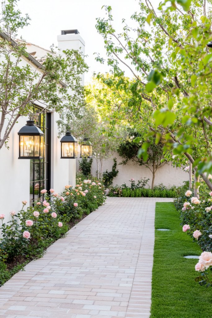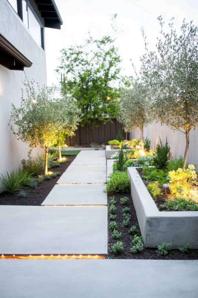 For a modern twist, opt for sleek concrete paths paired with geometric plant beds. Enhance the vibe with ambient lighting along the pathway to create a chic and sophisticated garden space.
