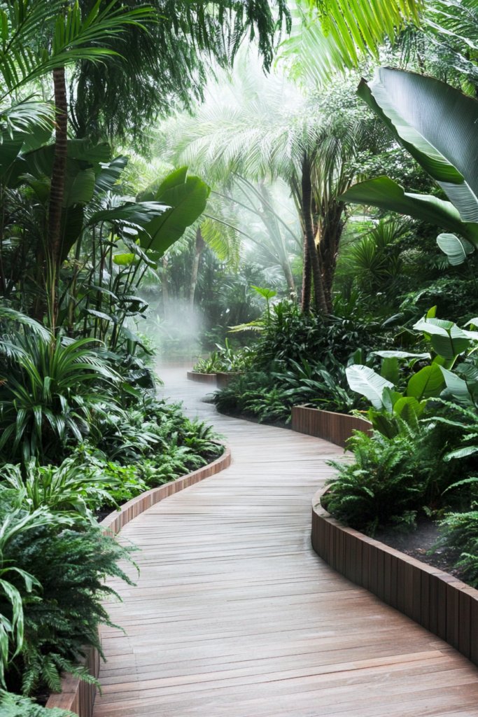 A winding wooden pathway leads through dense tropical plants and misty air in this rainforest-inspired garden. Add water features for a serene, lush ambiance.