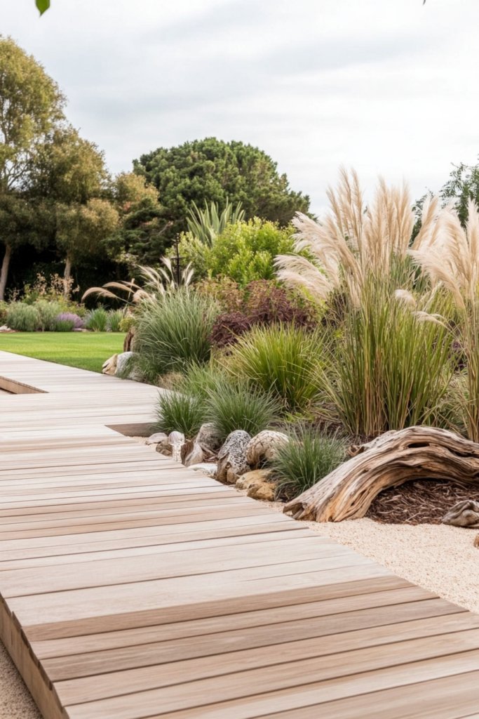 A wooden boardwalk pathway winds through sea grasses and driftwood accents in this coastal-inspired garden. Use weathered outdoor furniture for a relaxed beachside vibe.