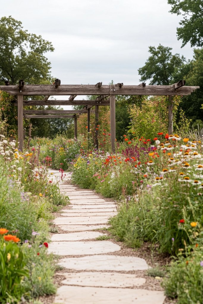A natural stone pathway winds through tall, colorful wildflowers and a rustic wooden arbor. Add birdhouses or bee hotels to invite wildlife into your garden.