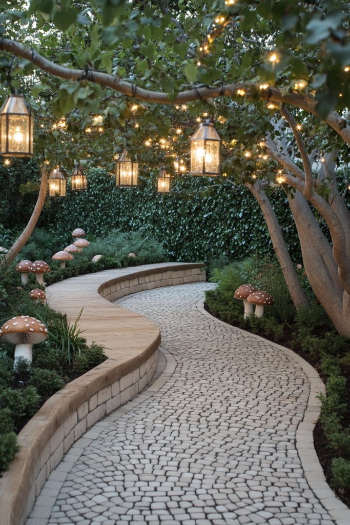 A curved cobblestone pathway leads through a magical garden filled with whimsical mushrooms and sparkling lanterns hanging from trees. Ideal for a storybook-inspired outdoor space.