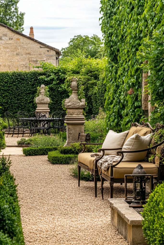 A charming vintage garden with a gravel pathway, wrought-iron garden furniture, and aged stone statues covered in ivy. Use muted tones for a timeless feel.