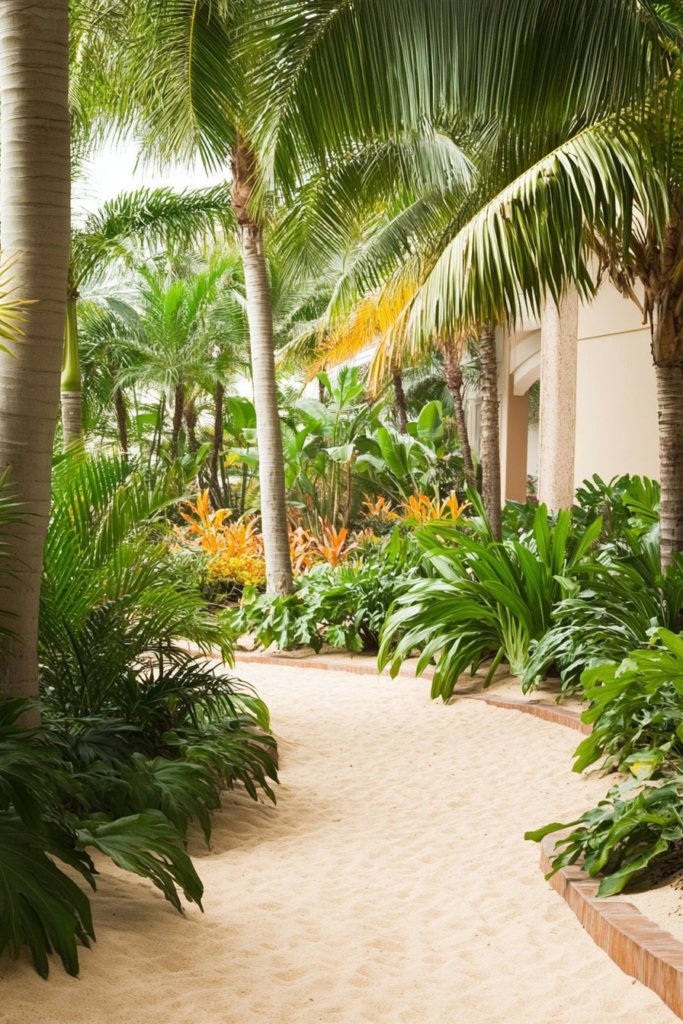 Transform your garden into a tropical escape with a sandy pathway bordered by lush palms and vibrant greenery. Use driftwood accents and tiki-style lighting for a laid-back coastal feel.