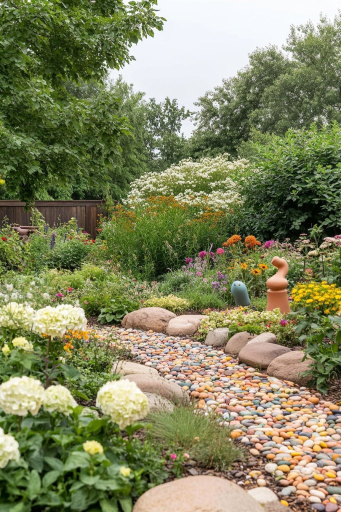 Bring playful charm to your garden with a colorful pebble pathway, vibrant blooms, and quirky sculptures. Use bright pots and cheerful decor to enhance the fun vibe.