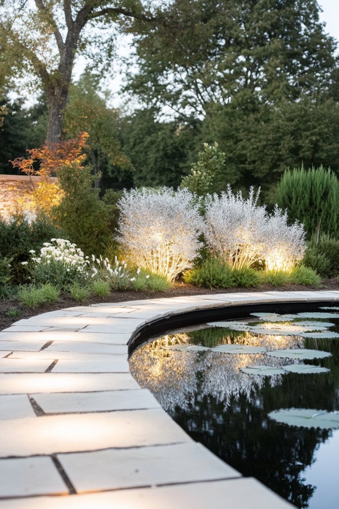 A softly lit stone pathway leads through a moonlit garden featuring reflective water ponds and silver-leaved plants that glow in the night. Use solar lights for a magical effect.