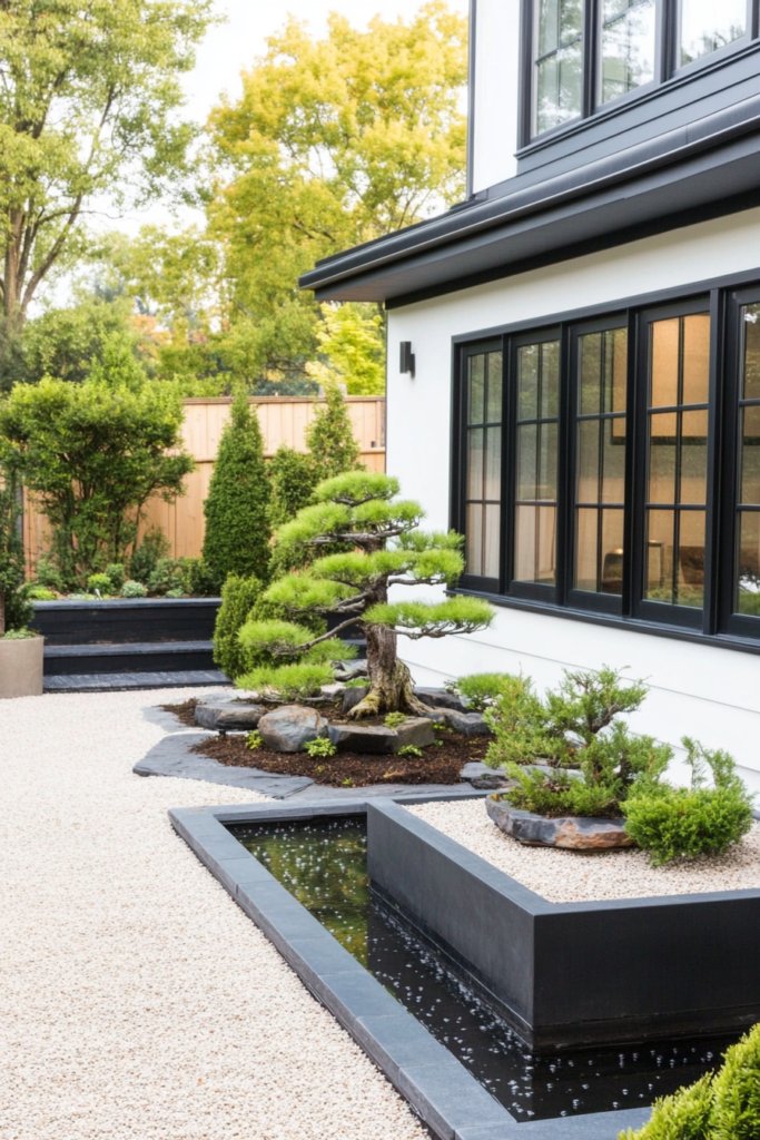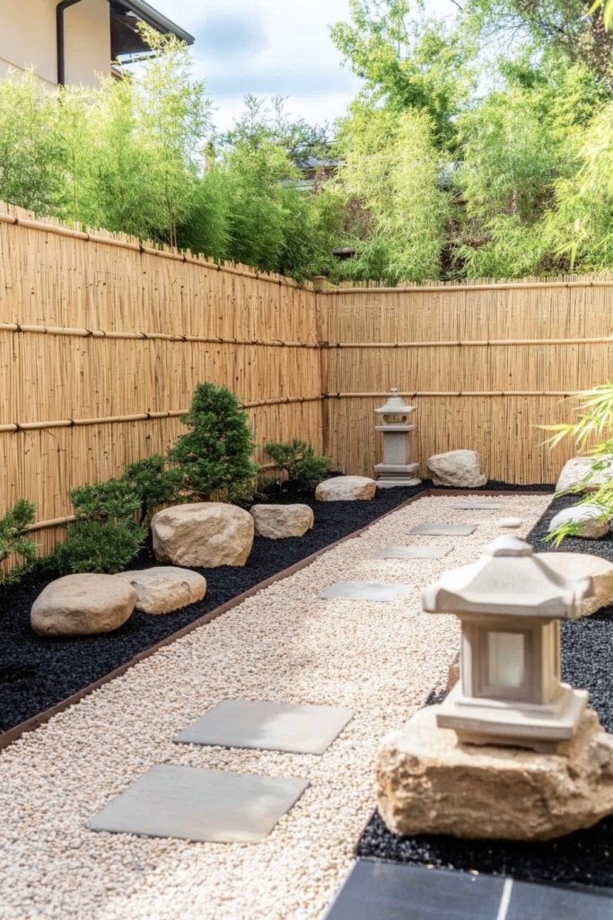 Serenity reigns in this , featuring a smooth gravel pathway, bonsai trees, and a calming water feature. Incorporate bamboo fences for an authentic, tranquil atmosphere.