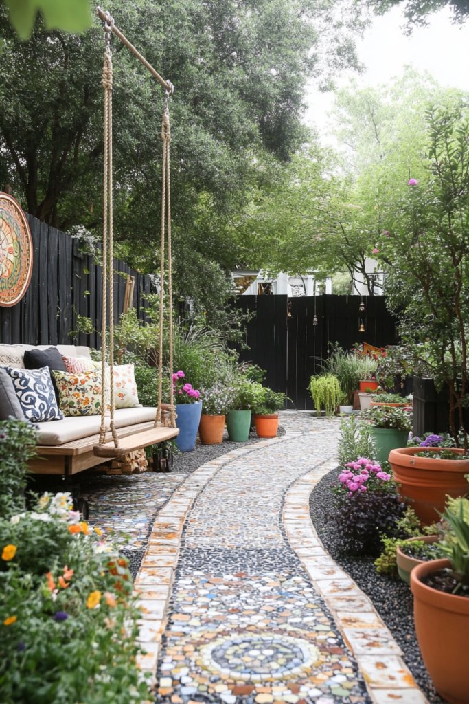A mosaic stone path adds a colorful, artistic touch to this Bohemian-style garden. Fill the space with vibrant potted plants and whimsical elements like a garden swing for a playful vibe.