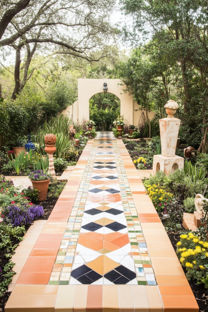 A unique mosaic pathway made of colorful tiles winds through a garden filled with creative sculptures and eclectic plantings. Ideal for adding artistic flair to your outdoor space.