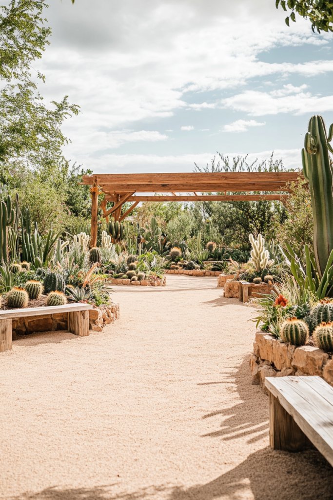 A sandy pathway cuts through a landscape featuring cactus arrangements and rustic wooden accents. Incorporate terra-cotta pots and for a low-maintenance garden.