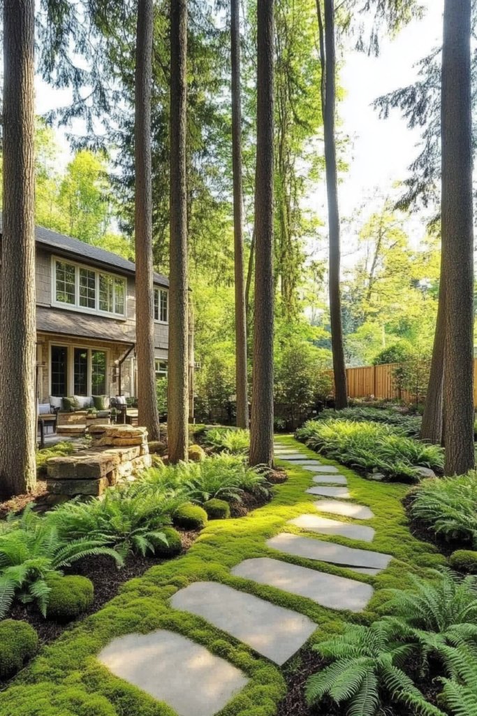 This woodland-style garden features a moss-covered stone pathway, towering trees, and shaded fern beds. Perfect for creating a serene, forest-like escape.