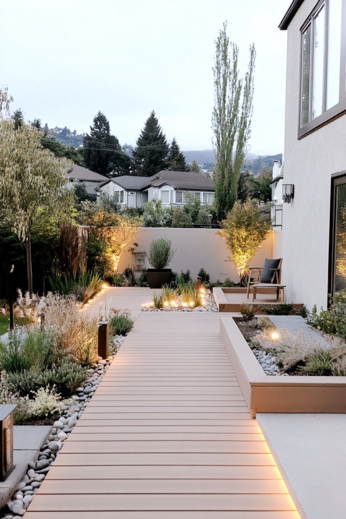 A modern Scandinavian garden featuring a wooden deck pathway, minimalist landscaping, and soft ambient lighting along the edges. Keep the design simple with neutral tones.