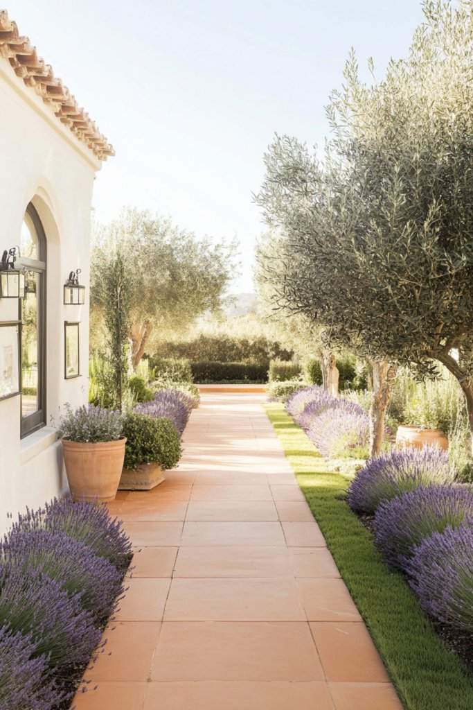 A terracotta pathway winds through lavender and olive trees in this calming garden. Use terracotta pots overflowing with vibrant blooms for an authentic look.