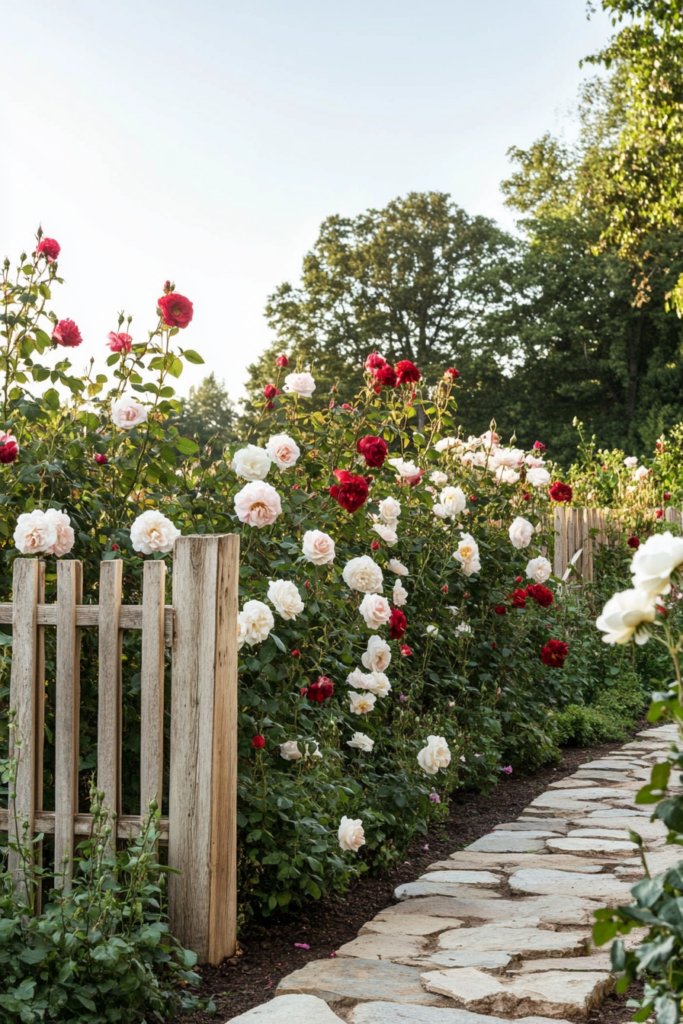 A rustic stone pathway winds through this charming cottage-style garden, with wooden fences and climbing in full bloom. Add weathered garden signs for a nostalgic touch.