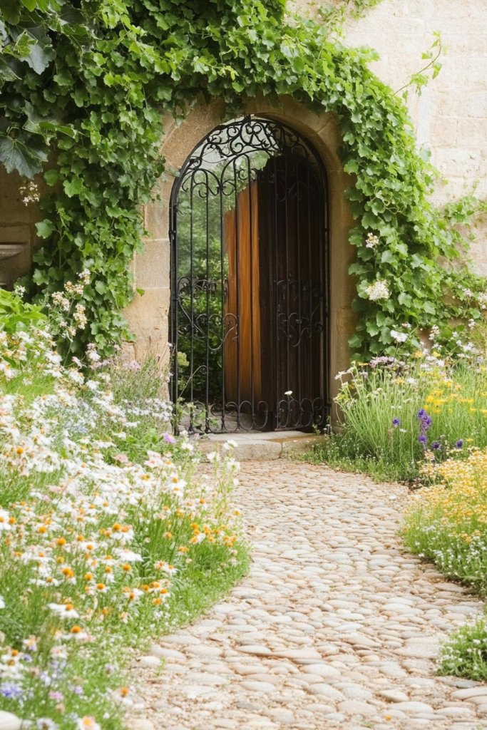 Rustic charm meets natural beauty with a cobblestone path and wildflowers. A vintage iron archway draped in ivy adds a storybook touch. Pair with antique planters for a timeless aesthetic.