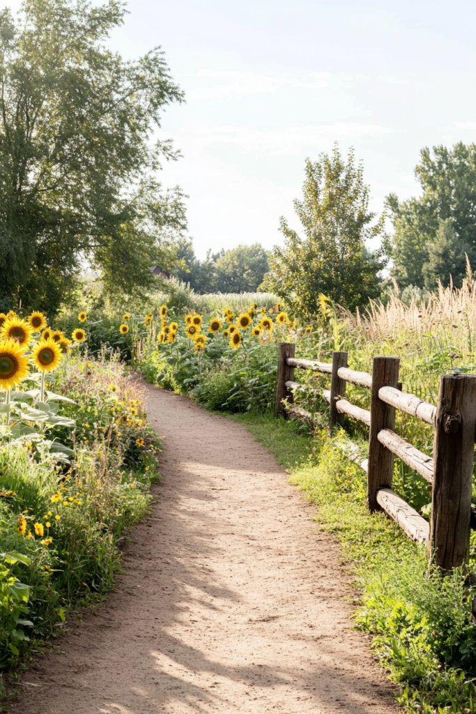 A dirt pathway winds through a countryside garden bordered by , wild grasses, and rustic wooden fences. Add vintage watering cans for a nostalgic touch.