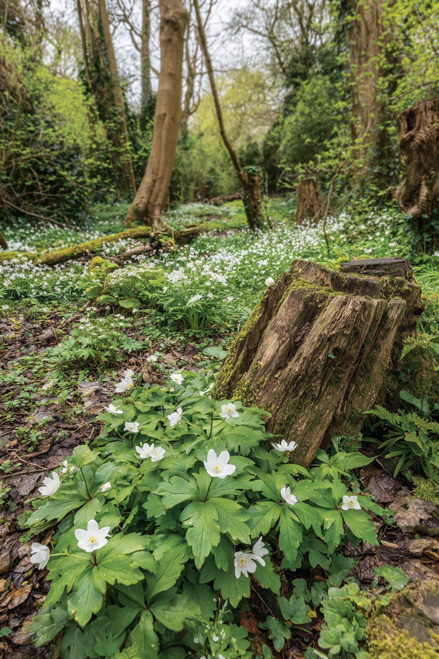 To recreate this style, include varieties such as Anemone nemorosa (wood anemone) and ferns like Athyrium niponicum (Japanese painted fern) for texture and contrast.