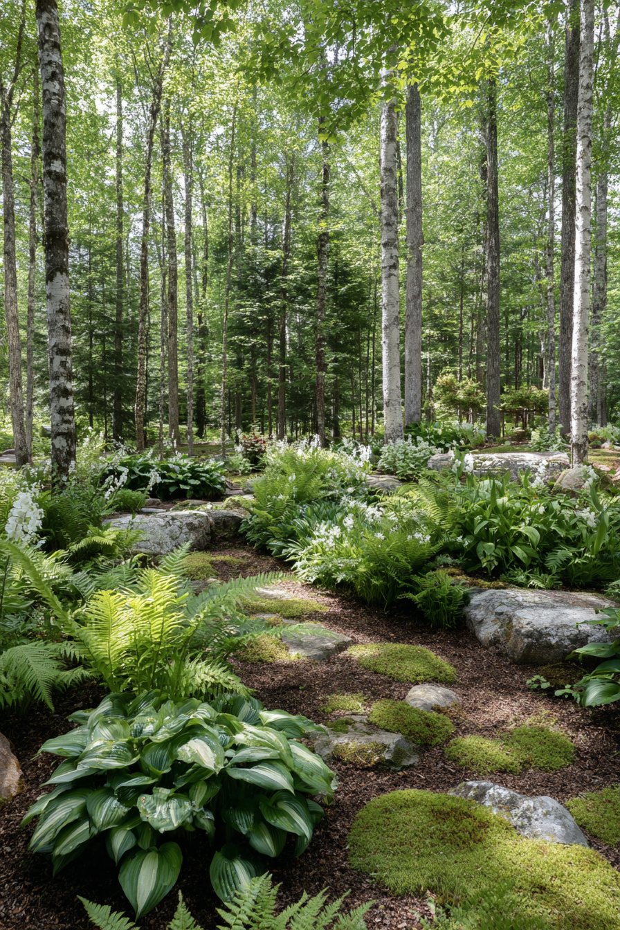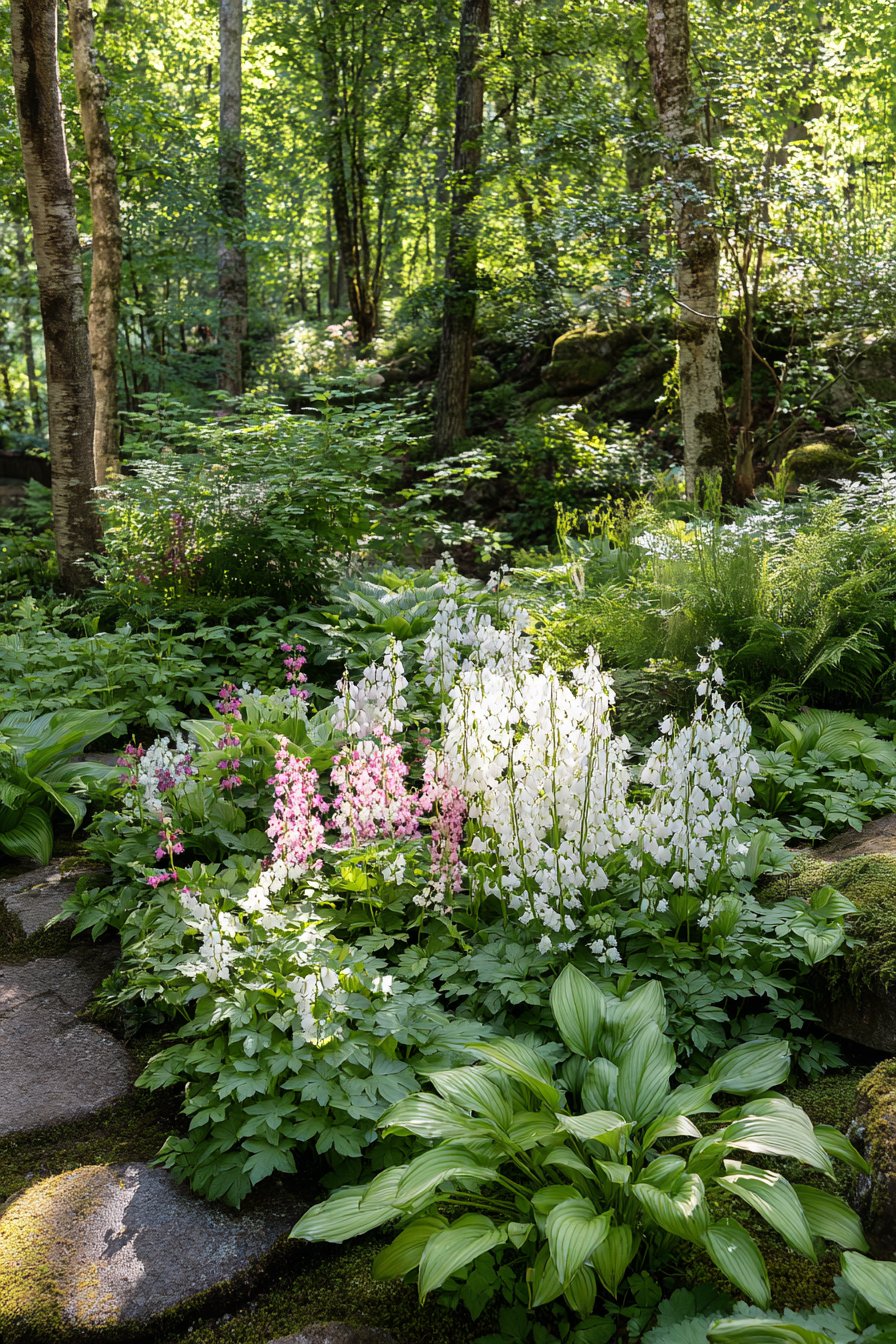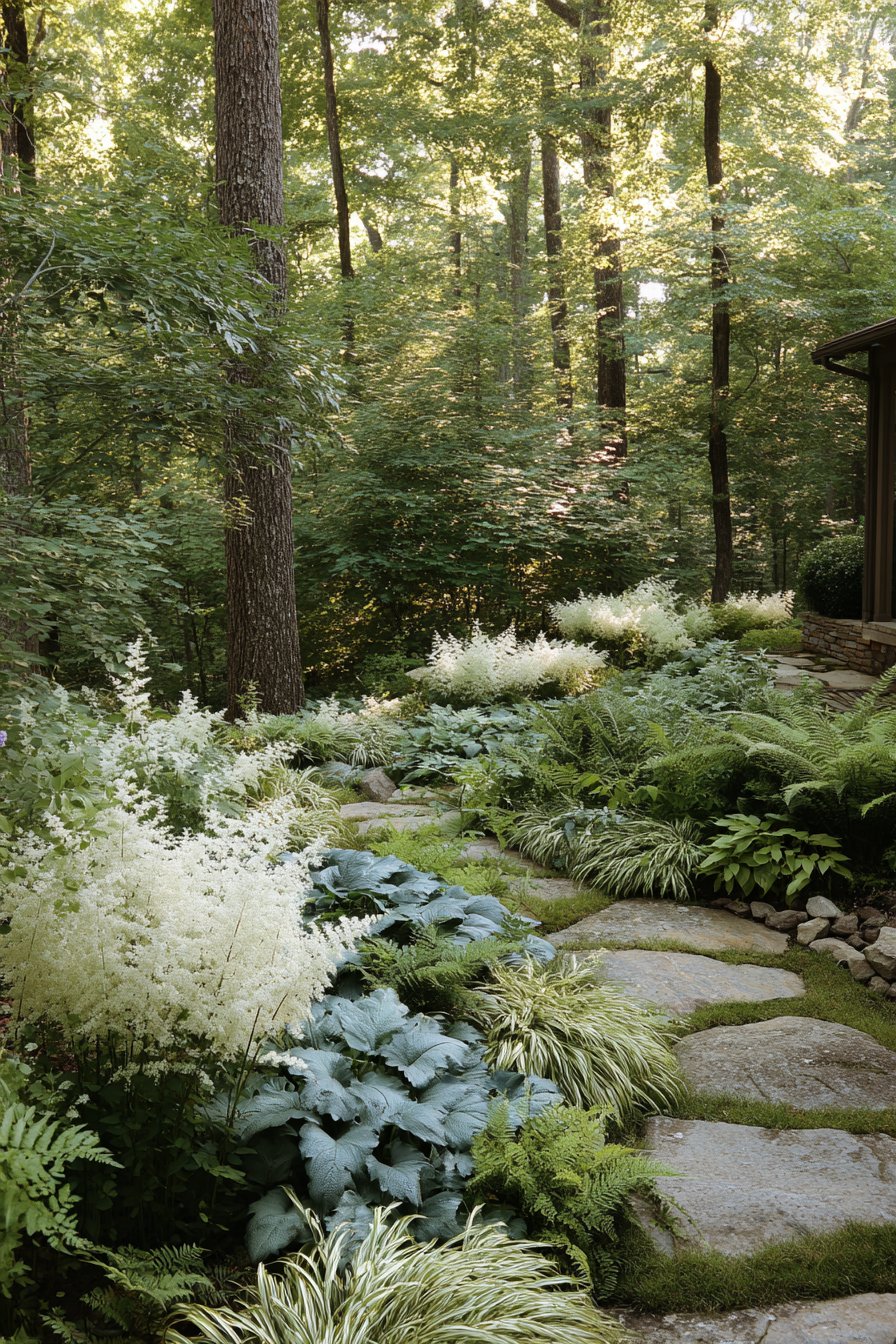 To recreate this look, include hostas, ferns, and astilbes along with low-maintenance ground covers like moss and creeping thyme for a vibrant, serene atmosphere.