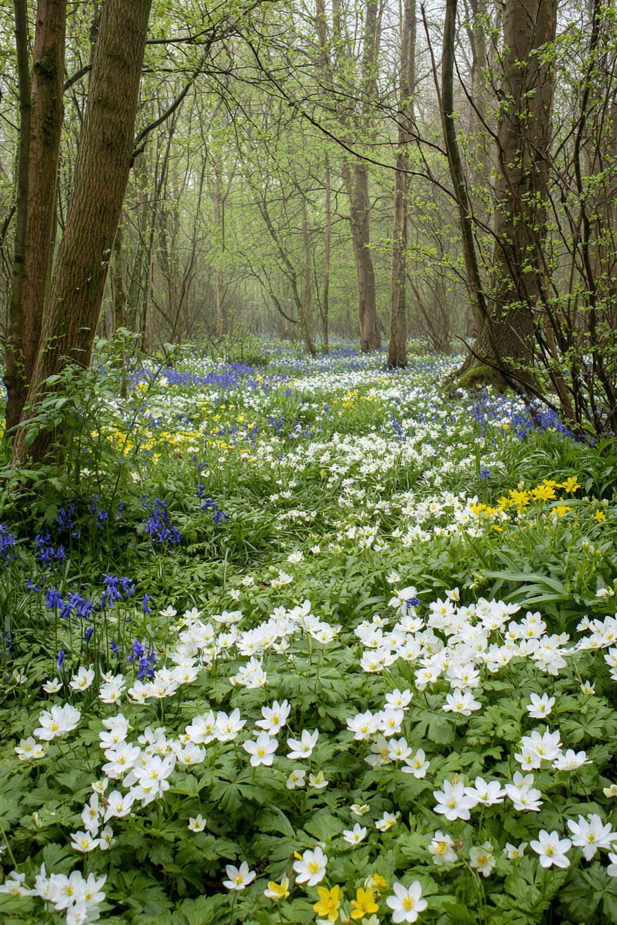 The enchanting blend of white anemones, vibrant bluebells, and cheerful daffodils creates a harmonious tapestry under the gentle canopy of trees, inviting tranquility. To achieve this woodland charm, layer diverse textures and colors, ensuring a mix of early bloomers and lush greenery for year-round interest.