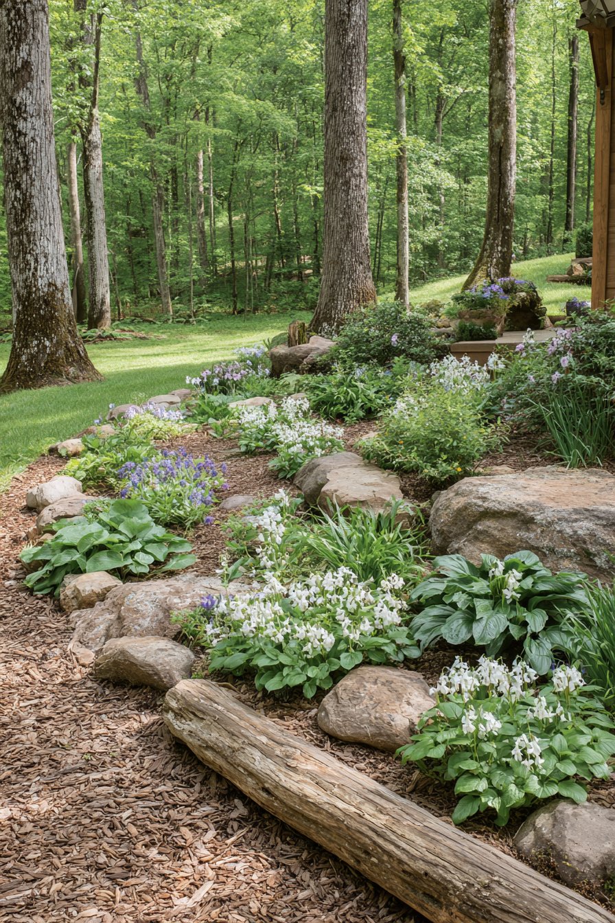 For a similar effect, include varieties like hostas, bleeding hearts, and bluebells, paired with decorative stones and natural wood elements for added charm.
