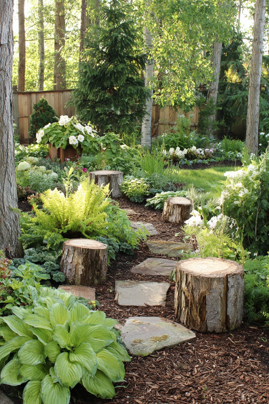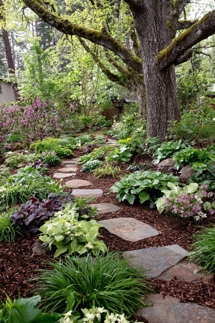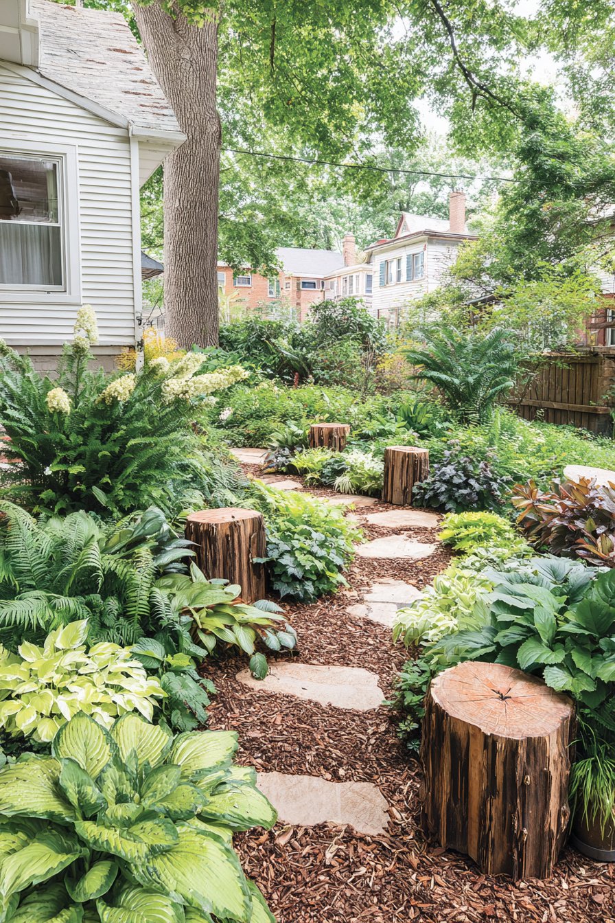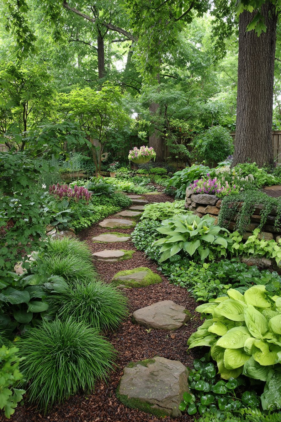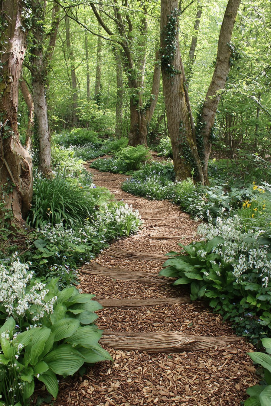 For a similar aesthetic, include hostas, bluebells, and ferns, complemented by stepping stones or wooden planks to guide the way.