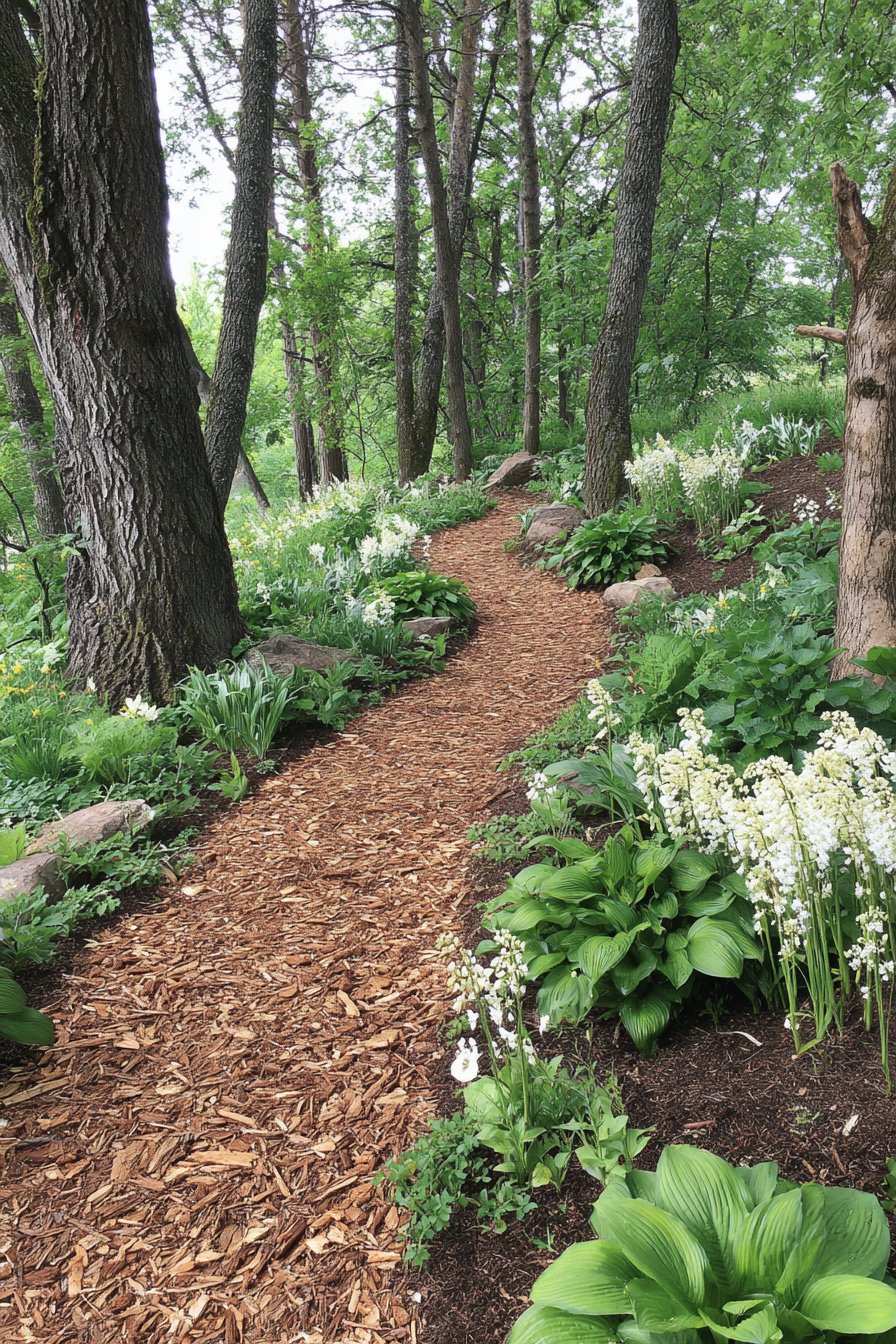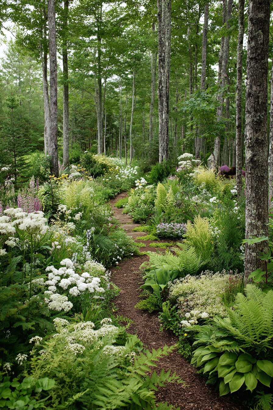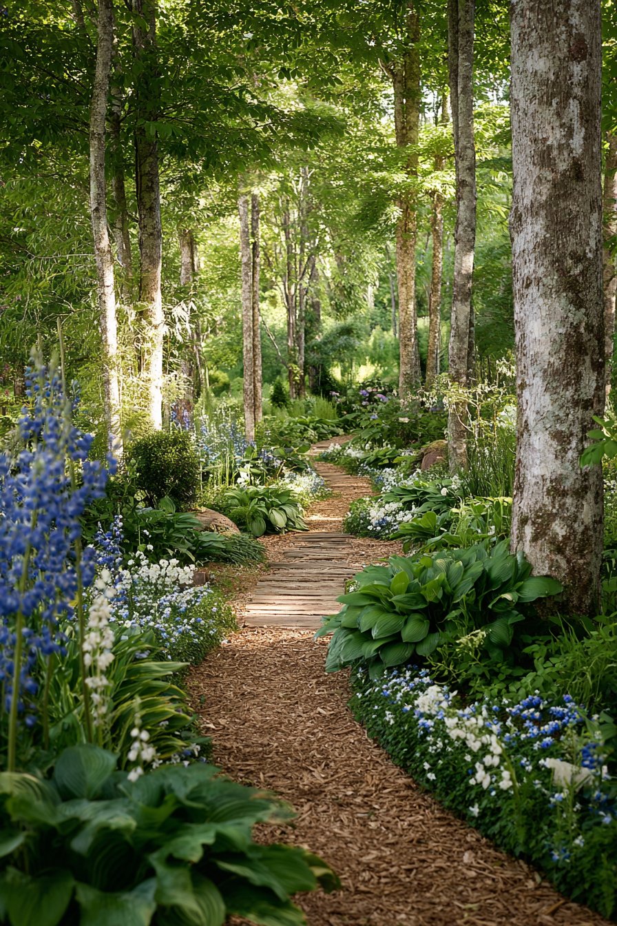 The serene woodland pathway invites tranquility with its rich textures, soft greens, and delicate whites, creating a harmonious blend of nature and design. To achieve this look, incorporate a winding mulch path surrounded by lush hostas and ethereal white bellflower for a captivating garden retreat.