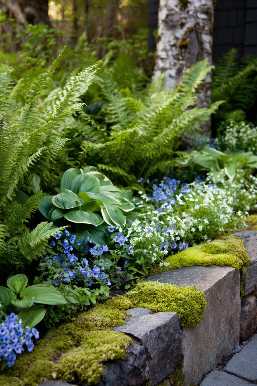 For a similar effect, use varieties like ‘Royal Standard’ hostas and ‘Lady Fern’ for their striking foliage, complemented by moss patches and smooth river stones.