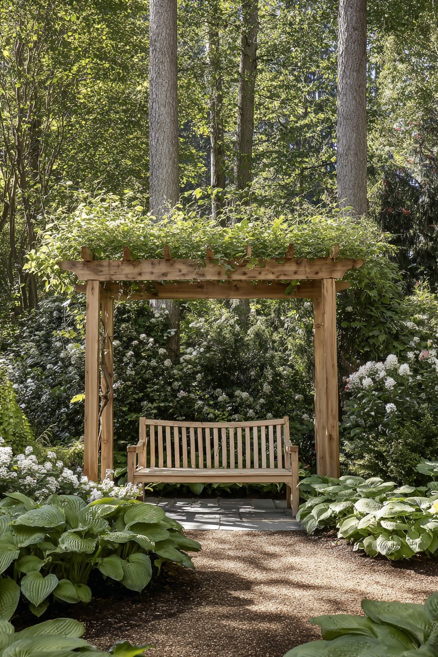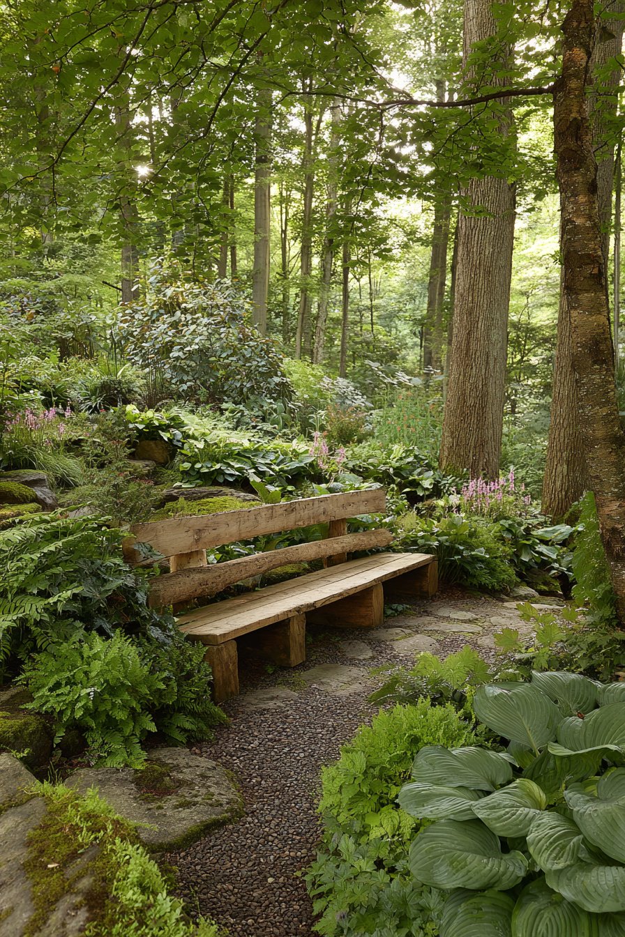 This woodland garden exudes tranquility with its lush greenery, layered textures, and the inviting warmth of natural wood, creating a perfect retreat. To achieve a similar look, incorporate a mix of hostas and hydrangeas alongside a rustic bench under a leafy arbor for a serene atmosphere.
