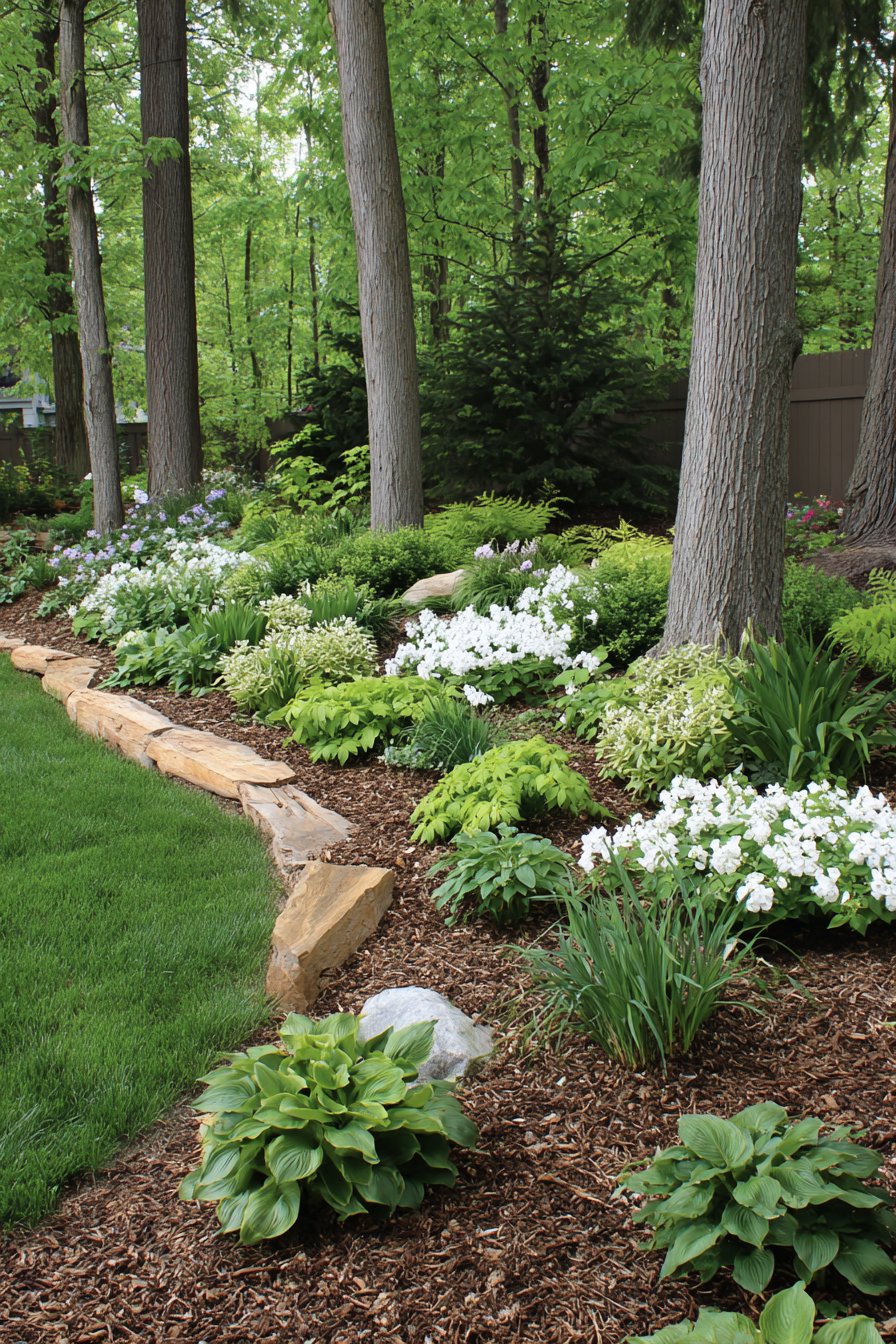 This woodland garden features a harmonious blend of lush greens and vibrant whites, creating a serene atmosphere that invites tranquility. Incorporate varied textures with ground covers and perennials while using natural stone accents for a polished yet organic look.