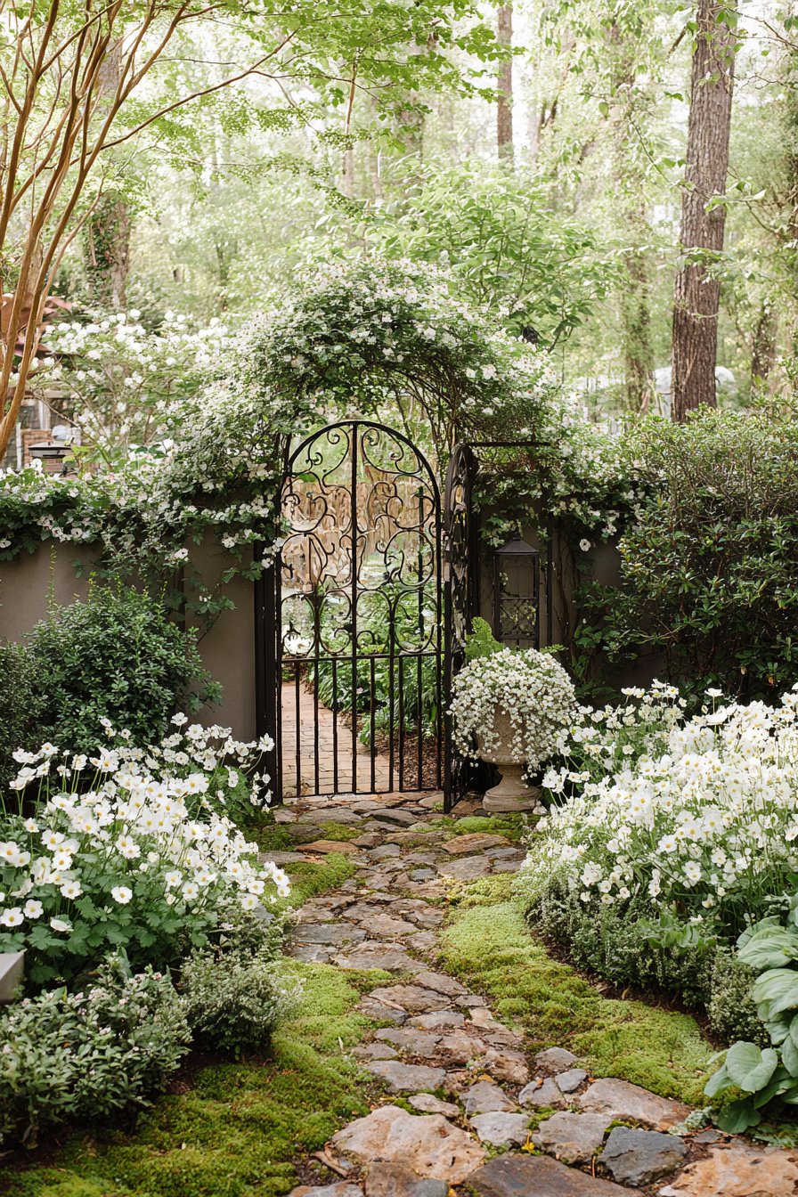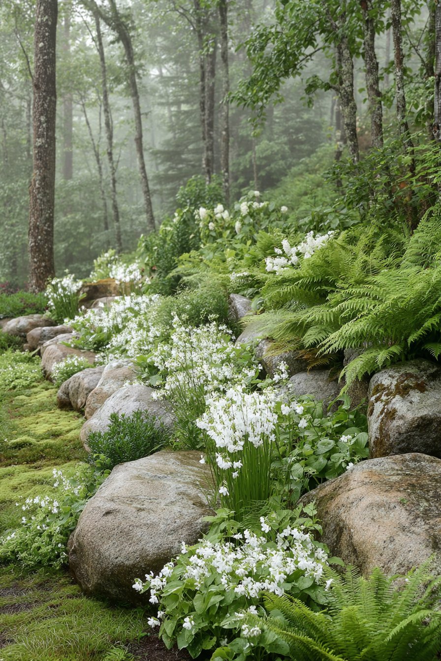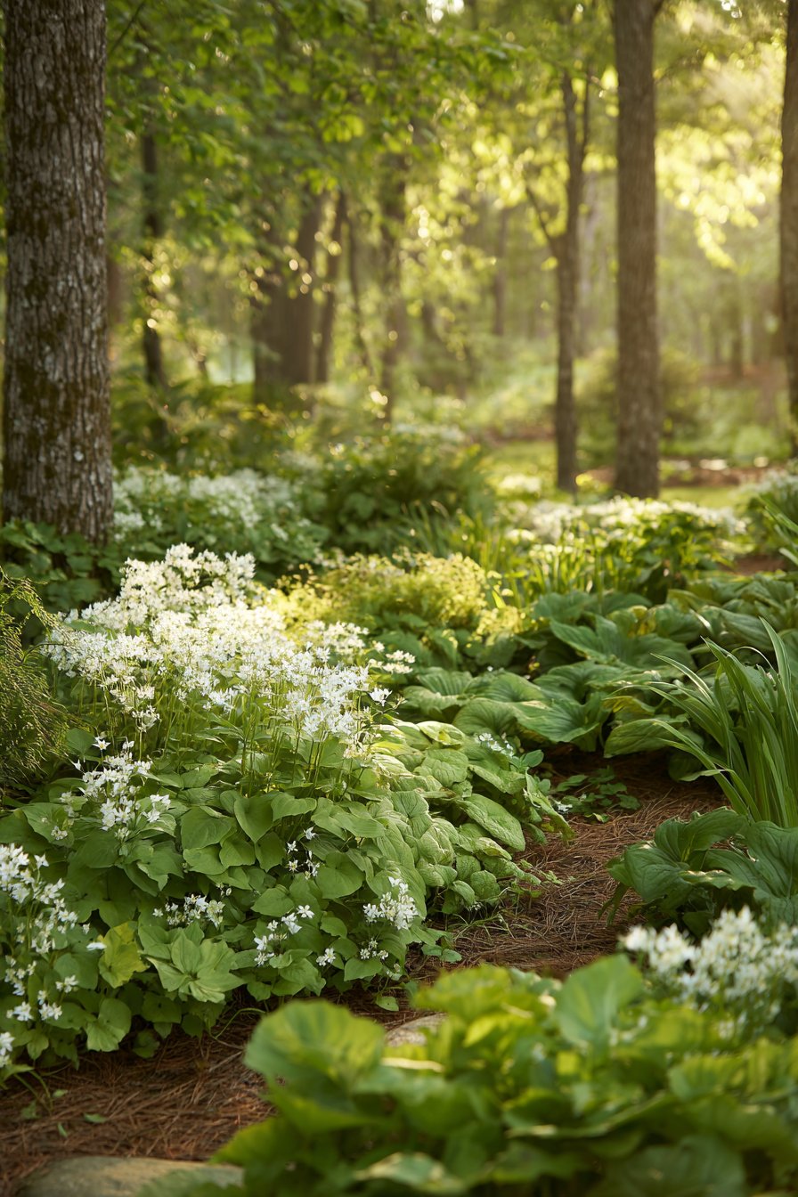 This woodland garden captivates with its serene white blooms and lush, green foliage, creating a tranquil and inviting atmosphere. To achieve this look, incorporate natural elements like moss-covered logs and a layered planting approach for texture and depth.