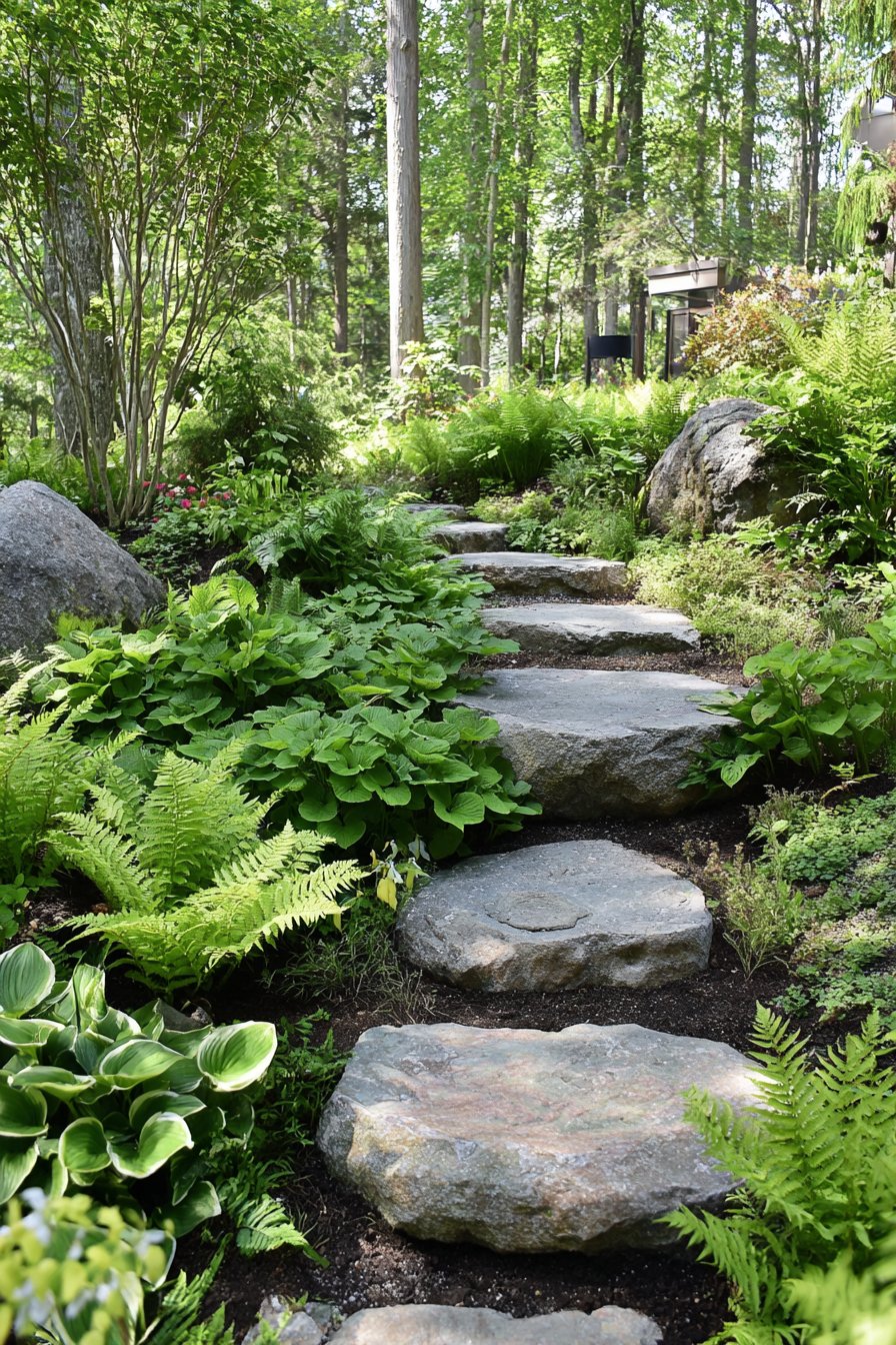 The tranquil stone path weaves through lush greenery, offering a harmonious blend of textures and shades that evoke a sense of serenity. Incorporate varied foliage, like hostas and ferns, alongside flowering plants for a layered, inviting woodland effect.