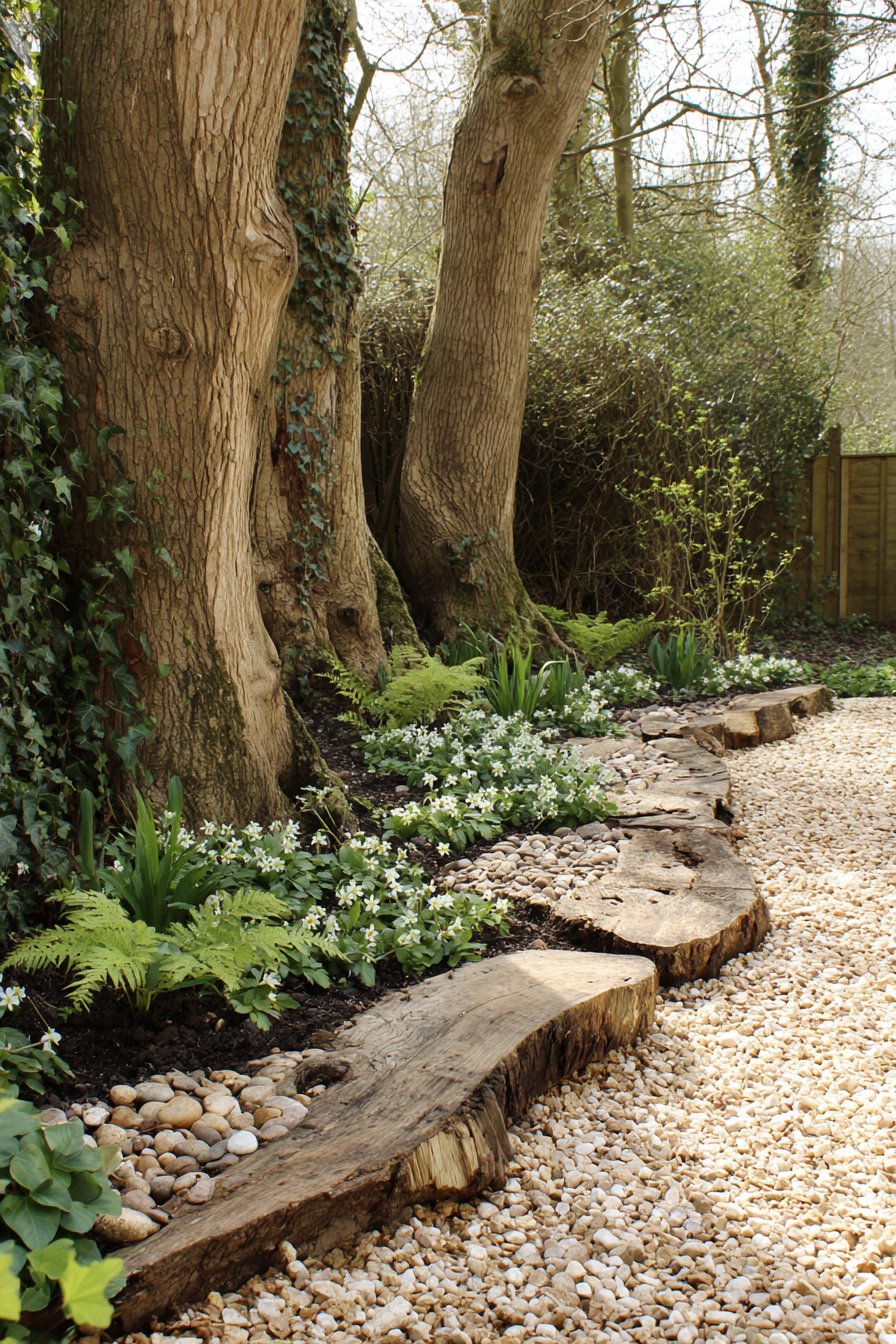 This woodland garden beautifully combines natural textures with soft, earthy colors, creating a serene pathway that invites exploration and tranquility. To achieve a similar look, incorporate layered plantings of ferns, snowdrops, and ivy alongside rustic wooden elements for a harmonious feel.