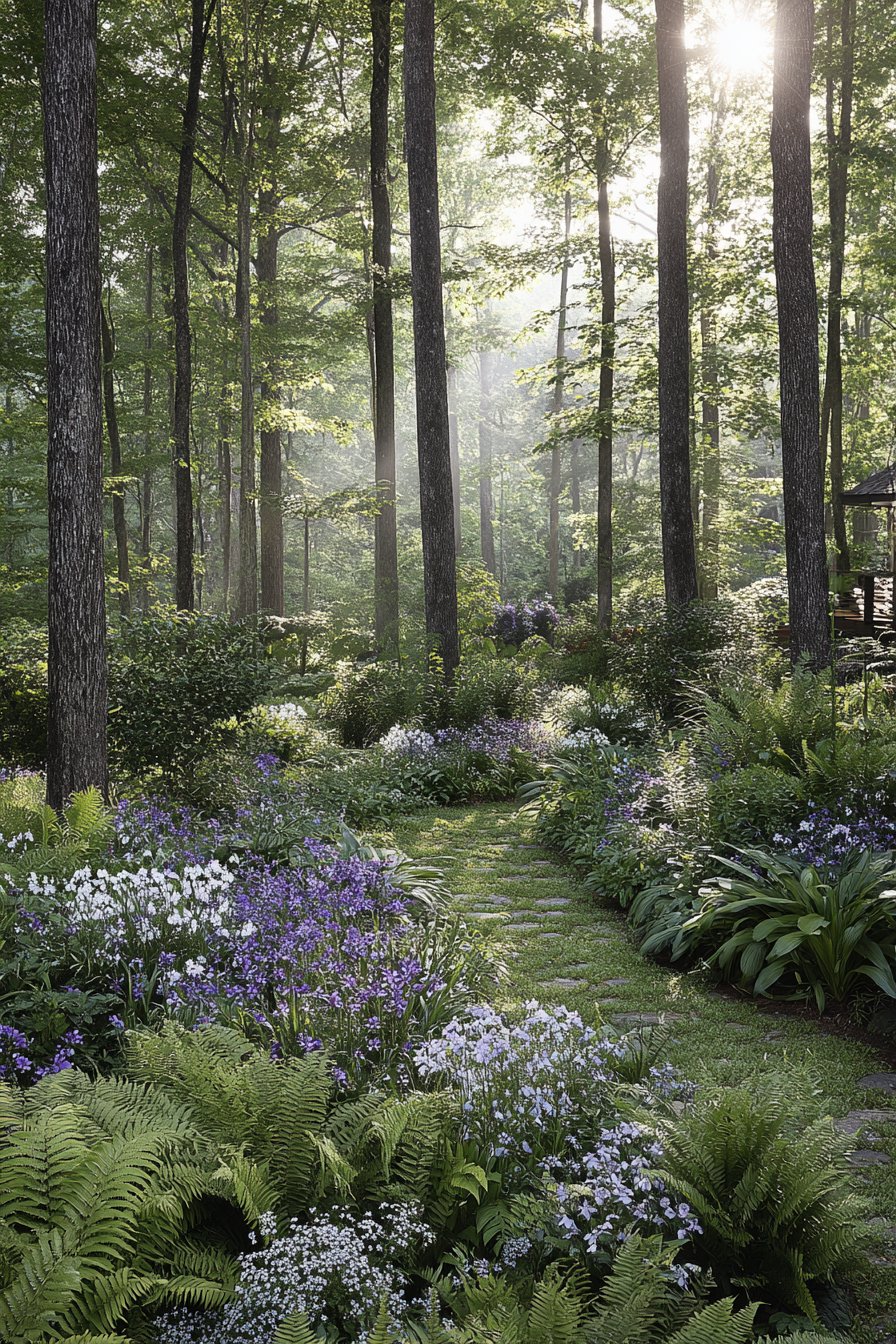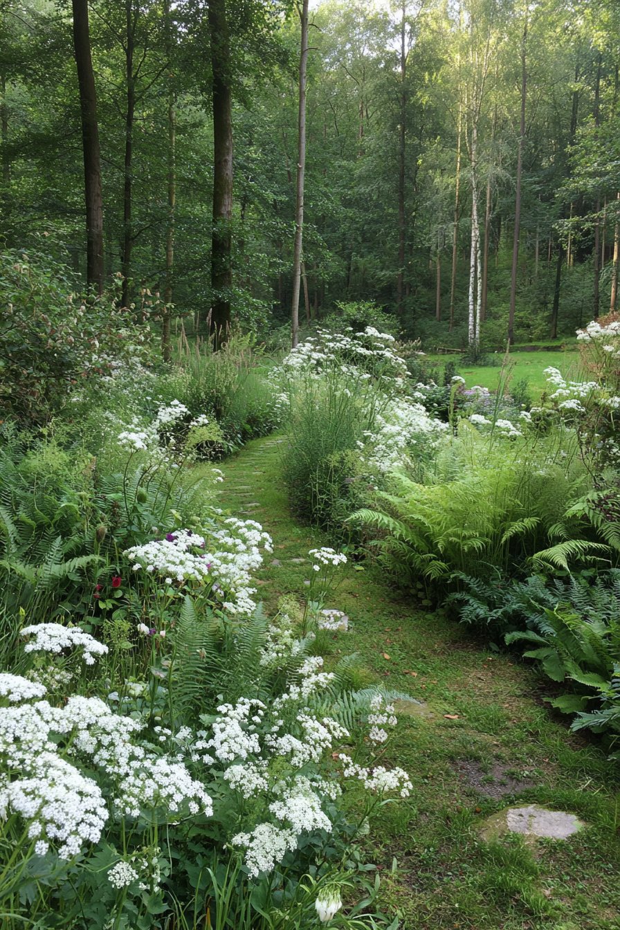 The serene woodland pathway features lush ferns and striking white blooms, creating a tranquil retreat that invites exploration and relaxation. To achieve this look, consider using natural stone for pathways and layering diverse foliage for texture and depth.