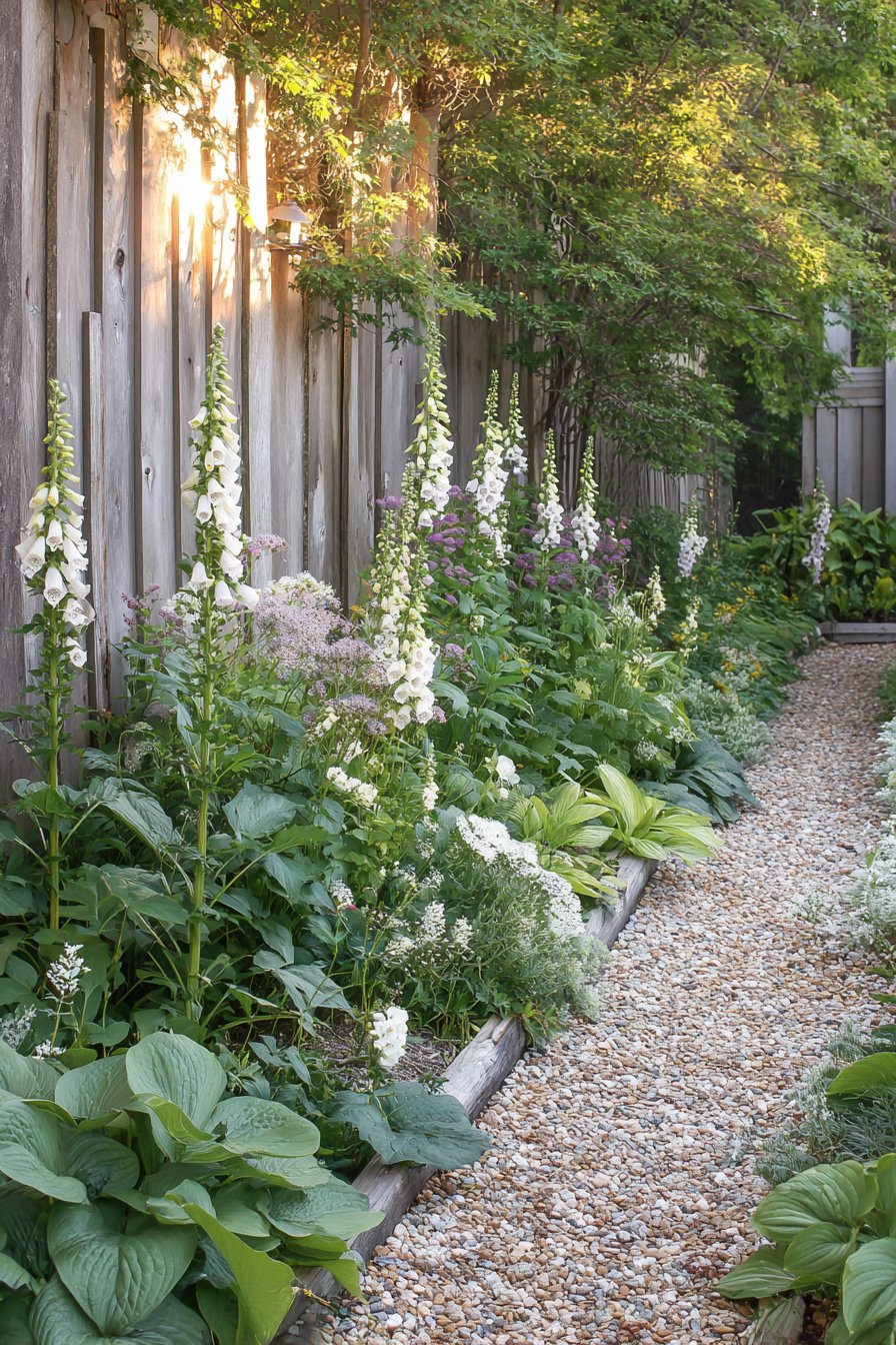 A serene woodland pathway showcases soft hues of green and white, with towering foxgloves and lush hostas creating a tranquil atmosphere. To achieve this look, incorporate natural stone pathways and a mix of perennials for texture and seasonal interest.