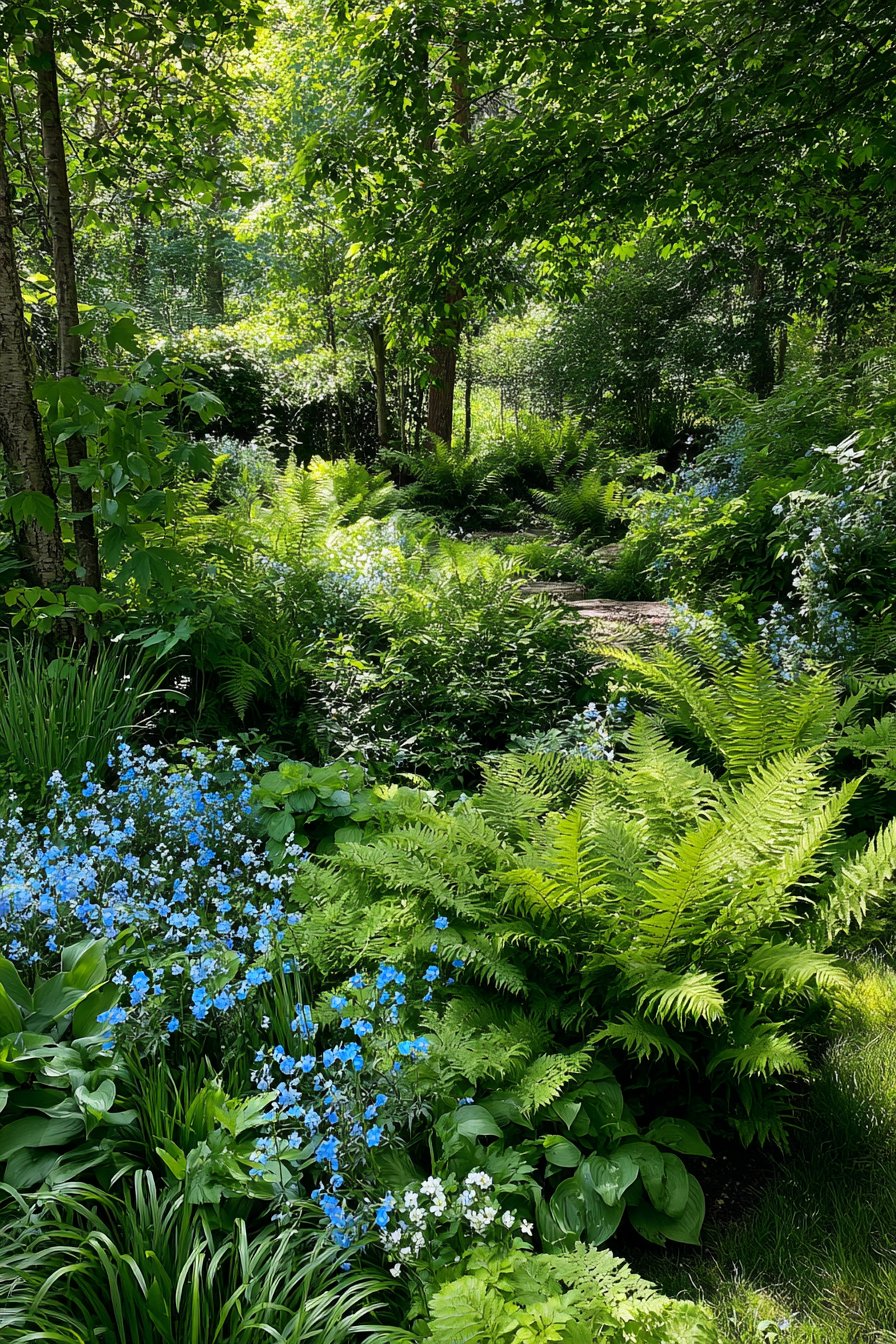 Lush ferns and vibrant blue flowers create a serene woodland atmosphere, inviting tranquility and a sense of nature’s embrace. Incorporate varying textures, like moss and stone, to enhance depth and visual interest in your garden edge.