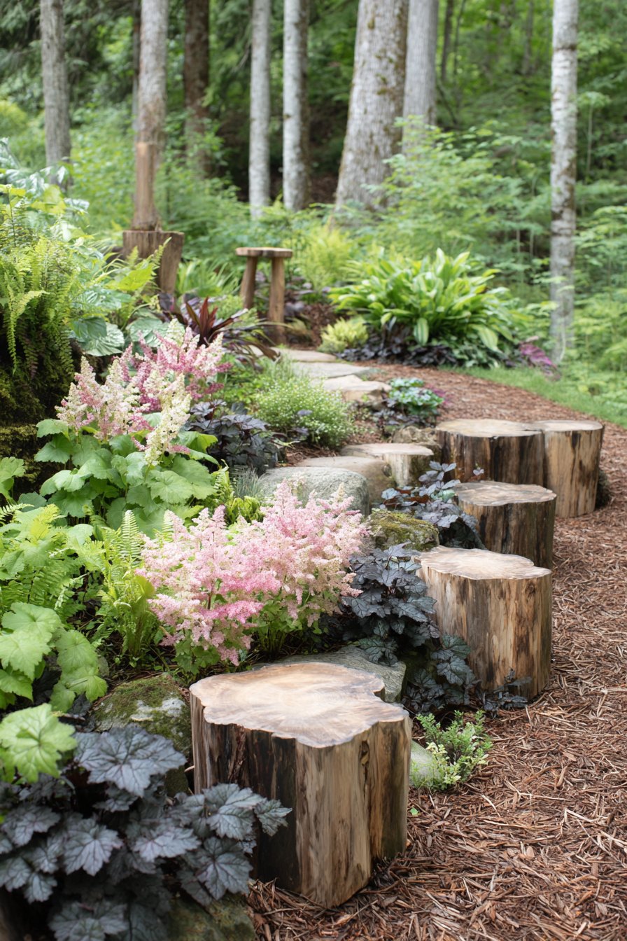 This enchanting woodland garden features lush textures and a harmonious color palette of soft pinks, deep greens, and rich browns, creating a tranquil retreat. To achieve this look, incorporate natural elements like wooden stumps and a diverse mix of ferns, hostas, and astilbes for layered interest.