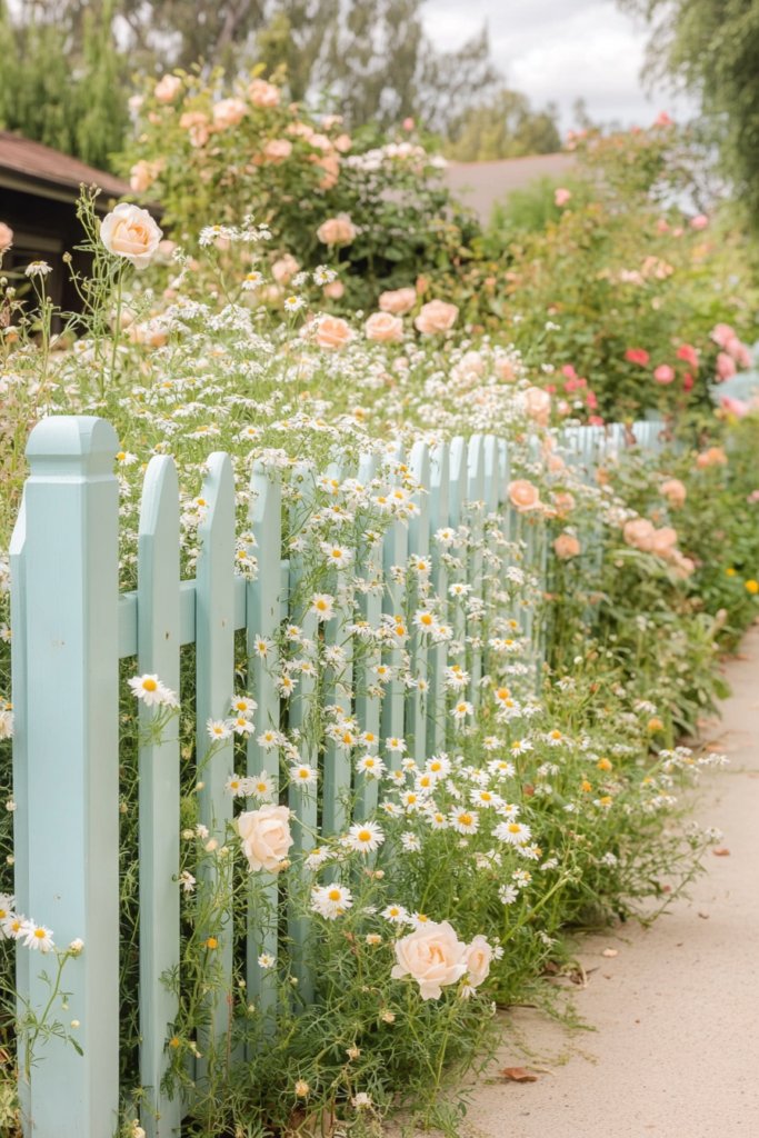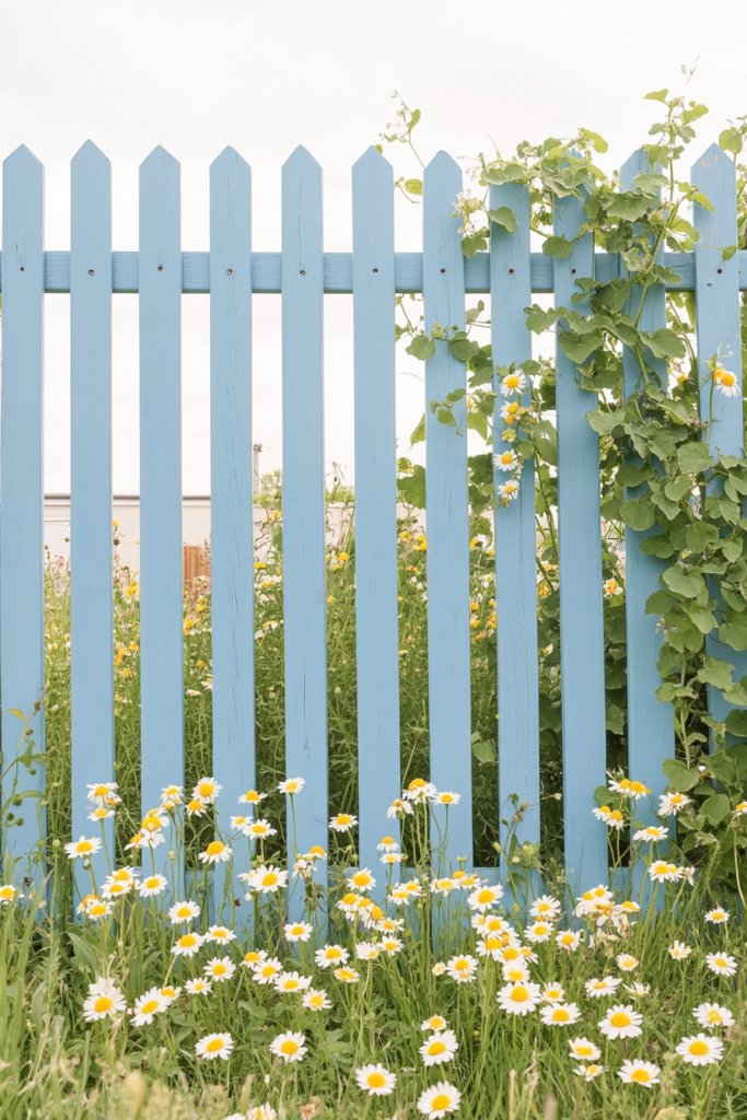 17. Pastel Blue Fence with Chamomile and Sweet Alyssum