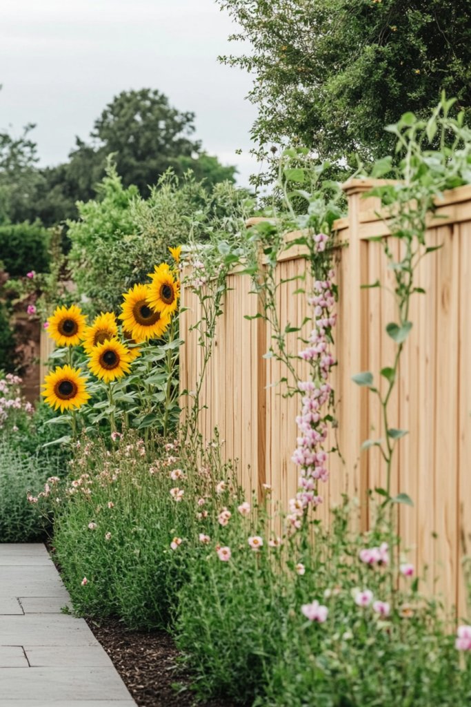 14. Natural Cedar Fence with Sunflowers and Sweet Peas