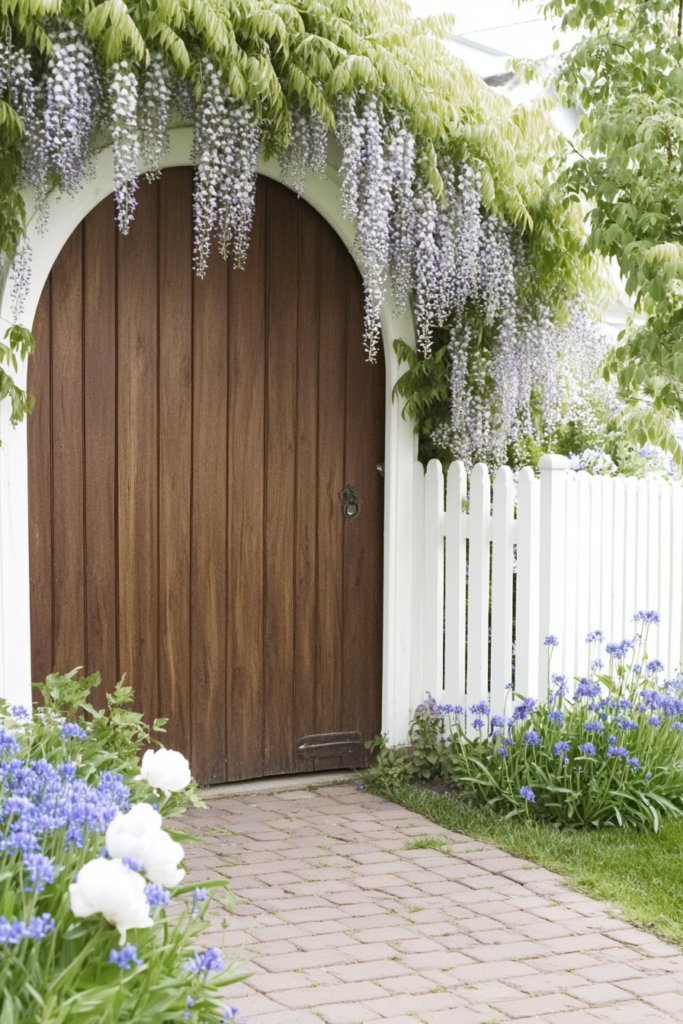 A charming arched wooden gate draped in cascading wisteria, nestled within a classic white picket fence. Bluebells and peonies bloom at its base, creating an enchanting entryway. Add a stone path and antique-style door hardware for extra character.