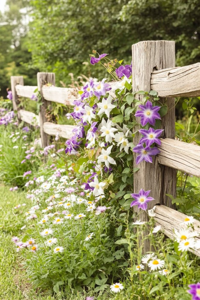 22. Rustic Wooden Fence with Honeysuckle and Wild Daisies